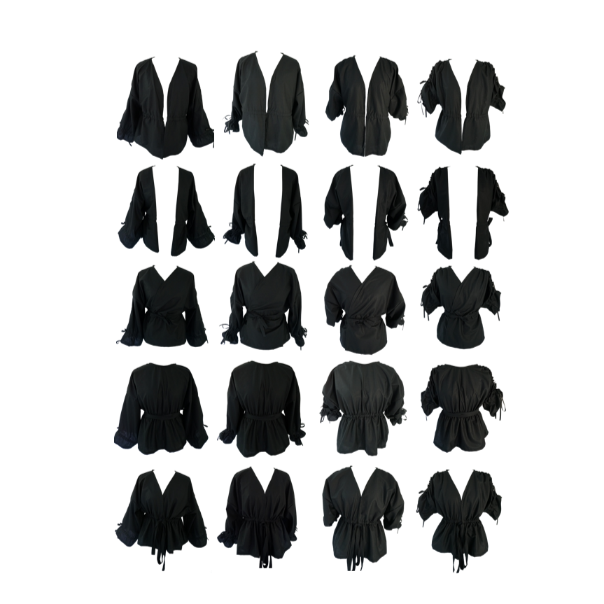 Just Margo clothing was designed to be adjustable, to represent sizes XXS-XXL in a single garment. By tying the cords/bands with varying tightness, the clothing adapts to your body <3